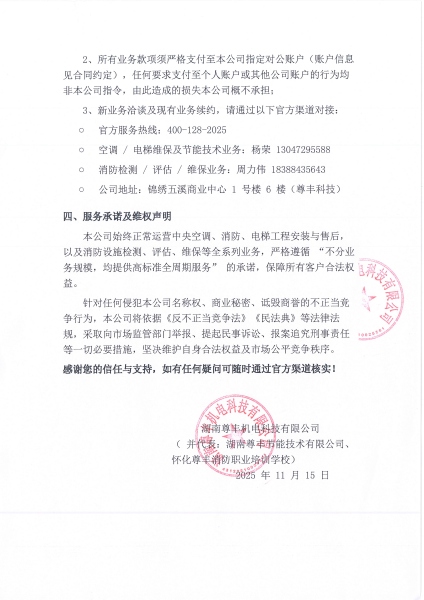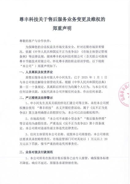 尊丰科技关于售后服务业务变更及维权的郑重声明