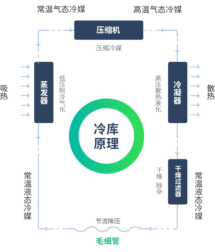 通过从冷库库房内蒸发器即排管或冷风机吸热,然后使在室外的冷凝器排放热量。通过压缩机做功驱动不断进行这样一个周而复始的逆卡洛循环,来保证库房内降温。